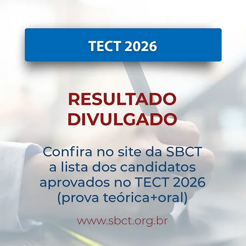 O aplicativo oficial da SBCT coloca todas as informações e serviços da Sociedade na palma da sua mão. Com ele, você recebe notícias e comunicados em tempo real, atualiza seus dados cadastrais, paga a anuidade de forma prática, fica por dentro dos eventos, além de acessar conteúdos exclusivos e se conectar com colegas de toda a rede SBCT. Baixe gratuitamente nas lojas Google Play e App Store e aproveite todas as vantagens de ser associado.