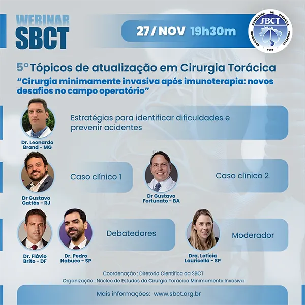 Coordenação : Diretoria Científica da SBCTOrganização : Núcleo de estudos da parede torácica SBCT Programa: 1. “Atualização em Reconstrução da Parede Torácica”Palestrante: Dr. João Paulo Cassiano de Macedo – SP 2. “Técnicas Abertas (Woller e Ravitch modificado) para Tratamento do Pectus Excavatum”Palestrantes:Dra. Fabiola Adelia Perin – RSDr. Artur Gomes Neto – AL 3. “Tratamento Minimamente […]
